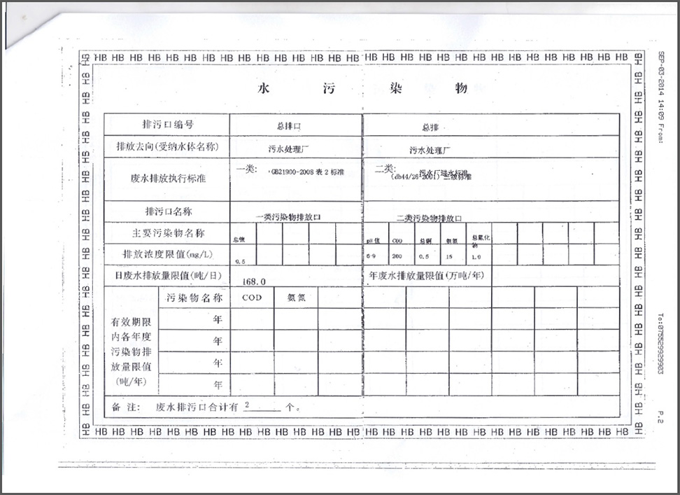 | 3 | 《深圳市建設(shè)項目環(huán)保設(shè)施驗收表》—深圳市環(huán)境保護局2005年9月16日 | 環(huán)保部門驗收意見:該項目能按我局環(huán)境影響審查批復(fù)要求執(zhí)行環(huán)保“三同時”有關(guān)規(guī)定,對生產(chǎn)中產(chǎn)生的生產(chǎn)廢水、廢氣進行治理。 該 項目在試運轉(zhuǎn)期間,環(huán)保設(shè)施運轉(zhuǎn)正常,處理效果良好。經(jīng)市環(huán)境監(jiān)測站驗收監(jiān)測,排放生產(chǎn)廢水達到DB44/26-2001中第二時段的二級標準(驗收監(jiān)測結(jié)果達標率80%以上)、排放廢氣達到DB44/27-2001的二級標準,達到環(huán)保驗收要求。 同意辦理該項目生產(chǎn)廢水處理設(shè)施的驗收手續(xù),根據(jù)審批批復(fù)排放量以及驗收監(jiān)測期間實際廢水處理量,核定該項目日排放生產(chǎn)廢水量不超過168噸。要求:1、驗收報告; 2、到市環(huán)保局辦理排污許可證、到市環(huán)境監(jiān)測站委托納入常規(guī)監(jiān)測;3、加強管理,保證日常穩(wěn)定廢水達標排放。 | |