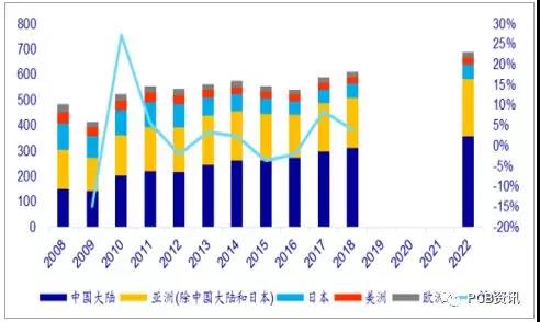 2015-2016 年全球宏觀經(jīng)濟(jì)不景氣,下游需求疲乏, PCB 產(chǎn)值首次呈負(fù)增長(zhǎng)。 2017 年 PCB 市場(chǎng)回暖,同比增長(zhǎng) 8.6%,是 2011 年以來(lái)增長(zhǎng)率最高的一年。各終端產(chǎn)品中, 除計(jì)算機(jī)萎縮外,其它產(chǎn)品維持平穩(wěn)水平,帶動(dòng) PCB需求增長(zhǎng)。另外,消費(fèi)市場(chǎng)的各類新興電子產(chǎn)品應(yīng)用,如穿戴電子裝置、電子助聽器、血糖儀、電動(dòng)汽車智能化裝置、 航空航天等領(lǐng)域,亦帶動(dòng) PCB 訂單增加。根據(jù)市場(chǎng)分析機(jī)構(gòu)在全球電子信息產(chǎn)業(yè)持續(xù)發(fā)展的帶動(dòng)下, 2017-2022 年,全球 PCB 產(chǎn)值復(fù)合增長(zhǎng)率為 3.2%,其中中國(guó)大陸 PCB 產(chǎn)值將從 2017 年的 297 億美元增至 357 億美元, CAGR3.7%。