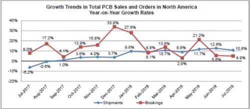 2018年7月份北美PCB總出貨量,與去年同期相比,增長了10.8%;年初至今的發(fā)貨量高于去年同期10.5%。與上個月相比,7月份的出貨量減少了19.1%。